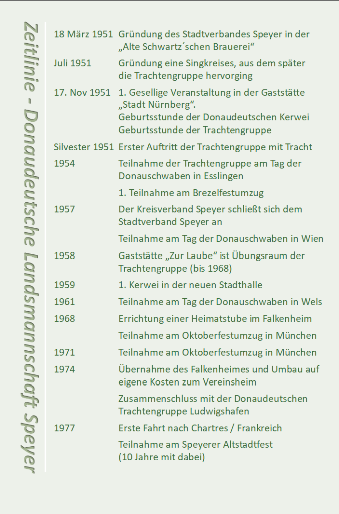 Bereits am 17. November 1951 fand die erste öffentliche Veranstaltung statt, ein Fest in Erinnerung an die Kirchweihen der alten Heimat. Diese Feier gilt bis heute als Geburtsstunde der Donaudeutschen Kerwei in Speyer. Über mehr als sechs Jahrzehnte hinweg wurde sie zu einem festen Bestandteil des Vereinslebens und zugleich zu einem sichtbaren Zeichen gelungener Integration in die Stadtgesellschaft.