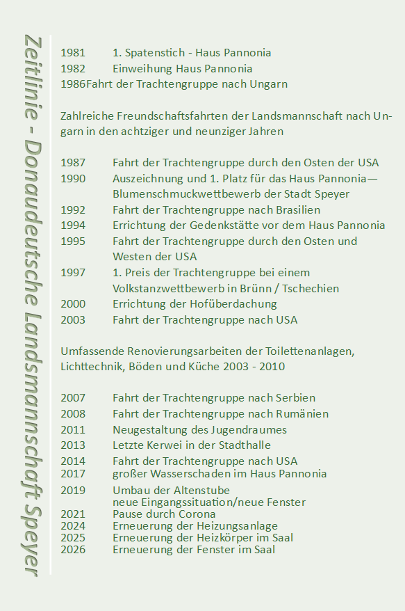 Mit lediglich 25.000 DM Eigenkapital, aber getragen von außergewöhnlichem ehrenamtlichem Einsatz, großer Solidarität, zahlreichen Spenden und umfangreichen Sachleistungen entstand zwischen 1980 und 1982 das Donauschwäbische Kultur- und Trachtenheim „Haus Pannonia“. Dieses Bauvorhaben wurde nicht nur von den Mitgliedern des Stadtverbandes Speyer getragen, sondern auch von vielen Helferinnen und Helfern aus den umliegenden Ortsverbänden, die mit ihrer Unterstützung eindrucksvoll den Zusammenhalt innerhalb der Landsmannschaft unter Beweis stellten. Der erste Spatenstich erfolgte 1981, die feierliche Einweihung am 12. Dezember 1982 markierte schließlich einen der bedeutendsten Meilensteine in der Geschichte des Vereins.