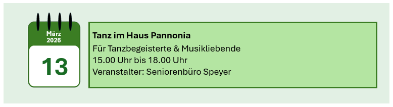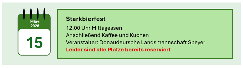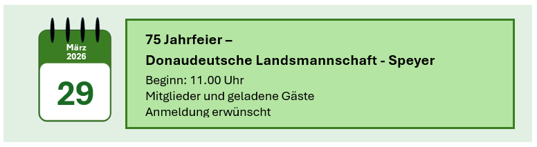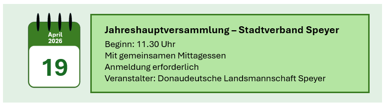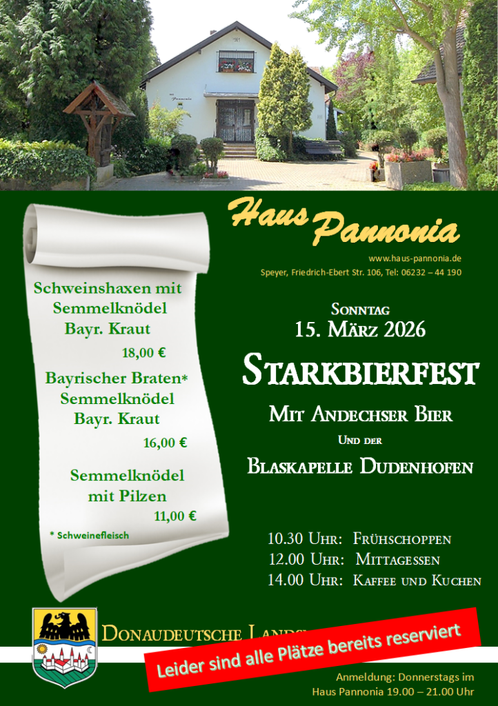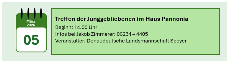Hier finden Sie Hinweise zu Veranstaltungen, die im Haus Pannonia geplant sind. Wir weisen auch auf Veranstaltungen hin, deren Verantwortlichkeit nicht bei der Donaudeutschen Landsmannschaft liegt.  Bitte beachten Sie die Hinweise auf den Veranstalter.